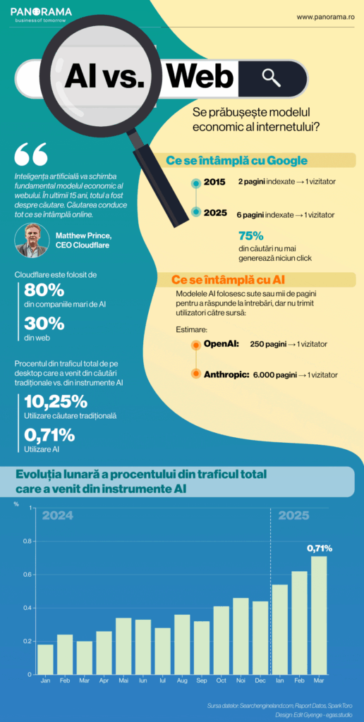 Inteligența artificială remodelează rapid economia internetului, amenințând modelul tradițional prin care conținutul online era descoperit și monetizat. De la Google până la OpenAI, giganții tech folosesc masiv algoritmi pentru a extrage răspunsuri concise din pagini web și a le prezenta direct utilizatorilor, fără ca aceștia să mai dea click pe vreun site. În tot acest timp, creatorii de conținut primesc tot mai puțin trafic și recunoaștere. Potrivit lui Matthew Prince, CEO-ul companiei de infrastructură web Cloudflare, acest dezechilibru riscă să submineze însăși sustenabilitatea web-ului deschis.